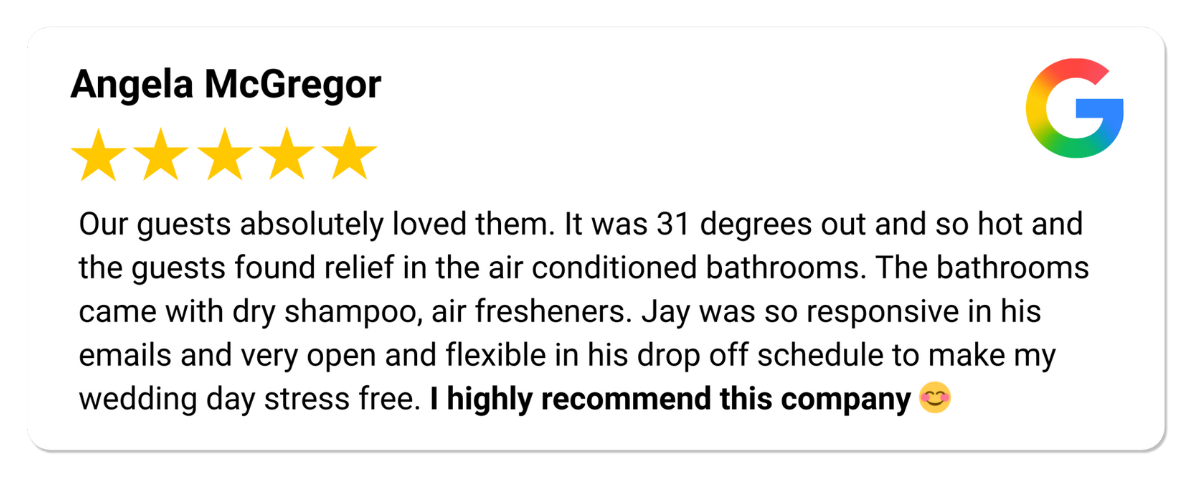We get that planning a wedding is stressful enough. That’s why we make it as seamless and worry-free as possible for you when it comes to your guests’ washroom needs.