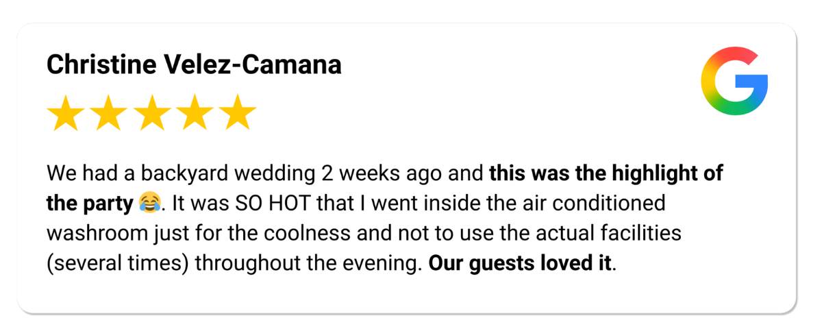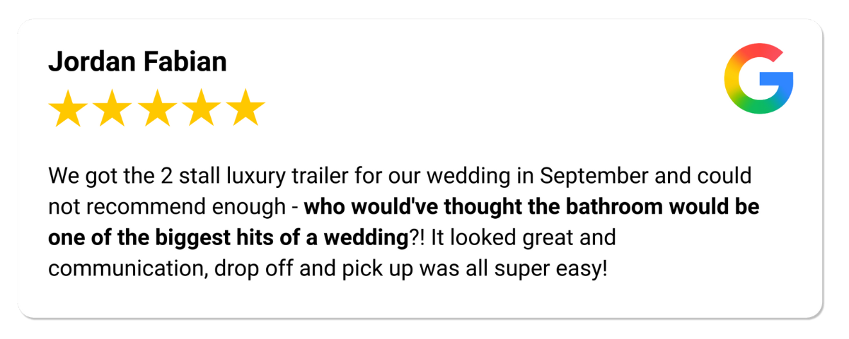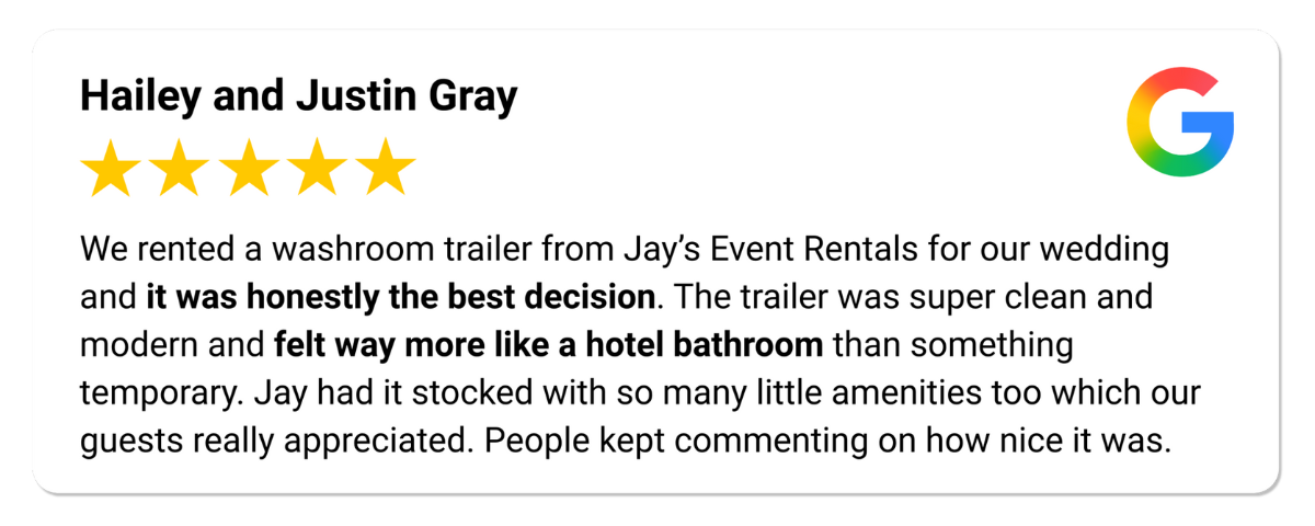 EXCELLENT Based on 27 reviews Lindsay T2025-09-09Trustindex verifies that the original source of the review is Google. Can’t recommend Jay enough! We rented the washroom trailer for our wedding this past weekend and were pleasantly surprised with how nice they were! Communication and service was great! Hailey and Justin Gray2025-09-01Trustindex verifies that the original source of the review is Google. We rented a washroom trailer from Jay’s Event Rentals for our wedding and it was honestly the best decision. The trailer was super clean and modern and felt way more like a hotel bathroom than something temporary. Jay had it stocked with so many little amenities too which our guests really appreciated. People kept commenting on how nice it was. Jay was awesome to work with from start to finish. He was easy to reach, quick to reply, and made everything so simple for us. Drop off and pickup were right on time and totally stress free. If you’re planning an outdoor wedding or event and want your guests to be comfortable, definitely go with Jay. David Lecovin2025-08-27Trustindex verifies that the original source of the review is Google. We found Jay’s Event Rentals great to work with. Jason was polite, prompt and easy to deal with. The bathrooms themselves were clean and luxurious (for bathrooms). I would not hesitate to recommend them. Marissa Barber2025-08-24Trustindex verifies that the original source of the review is Google. Renting from Jay it was fantastic ! Very good communication and service all around ! Lauren Marshall2025-08-18Trustindex verifies that the original source of the review is Google. 10/10 recommend! We used Jay's rentals for our wedding and everything was great from the communication, on time delivery and the washrooms were clean and stocked with everything and more that we needed. Thank you Jay!! Krista Nolan2025-08-03Trustindex verifies that the original source of the review is Google. Incredible service could not recommend enough! Set up was incredibly fast, communication was very simple and kind. The extra goodies like mints and bug spray were a major hit! 10/10 would recommend. Tafline Van Der Westhuizen2025-05-23Trustindex verifies that the original source of the review is Google. Absolutely wonderful experience with jays rentals, set up was easy and quick. Jay was on time and so friendly. The washrooms were pristine and all the washroom extras were very much appreciated. Highly recommend. Jordan Fabian2025-02-12Trustindex verifies that the original source of the review is Google. We got the 2 stall luxury trailer for our wedding in September and could not recommend enough - who would've thought the bathroom would be one of the biggest hits of a wedding?! It looked great and communication, drop off and pick up was all super easy! J Rai2024-10-15Trustindex verifies that the original source of the review is Google. Booked the luxury washroom trailer for my wedding events. They were so nice and Jay’s service is great!